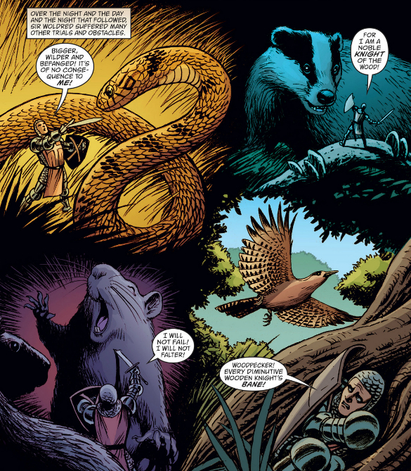 Patrick: I was actually quite surprised by how much of this issue was taken up with the little dude’s journey into the Sacred Grove. It’s such a compelling story, and I found myself fantasizing about a whole series of about the tiny-warrior battling shrews on the forest floor. Whatever we’re supposed to know about Geppetto (my Fables Encyclopedia confirms your wiki-summary), it’s almost impossible not to be taken in by his adventures. I mean, he fights a frog and calls it a dragon — how awesome is that! Braun so smartly draws all the animals as realistically as possible; any ounce of cartooniness would detract from plausibility of the threat they present. There’s no hint of anthropomorphism here — just look at the insipid look on his stupid frog-face.
