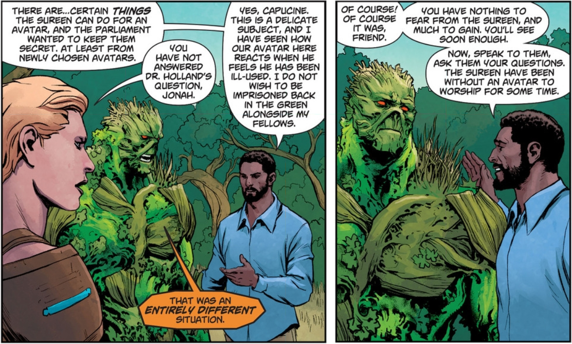 The mysterious robed group we saw last issue explains that they’re the Sureen — Avatar worshippers who are effectively Alec’s personal assistants. All they ask in return is that he grow them mind-altering fruits for them to munch on. Brother John is bemused to see the Sureen, but is too distracted by Capucine to offer much in the way of advice. Oh, right: it turns out Brother Jonah is the Avatar Capucine made her deal with all those centuries ago. Anyway, The Wolf and Lady Weeds use all of this distraction to sneak back to New Orleans, where the Wolf has designs to cash in on some “active concerns” he left behind. Alec sends Brother Jonah and Capucine after them, but then uses that exact moment to ask the Sureen to perform an ancient ritual which allows Alec to inhabit one of their bodies. Only, the Sureen aren’t who they say they are, and they sneak off with Alec’s uninhabited Avatar body and poison the human body he’s jumped to.