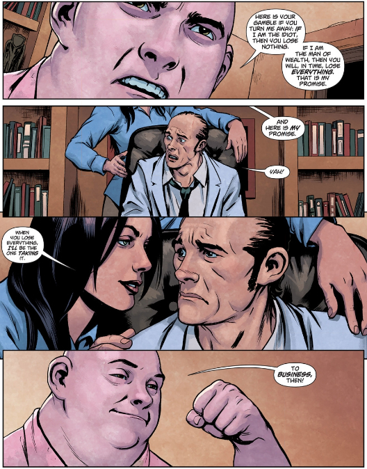 To business, then!I was torn between including this, or the three panels where The Wolf switches into intimidation mode (which features some stellar acting by Saiz), but as a showcase of this creative team’s abilities, it’s hard to beat this sequence. The first panel of the page (not included) shows the lawyer already taking a defensive posture to The Wolf’s verbal assault, but it’s not until Lady Weeds chimes in from behind him that we see how scared he is. Each shot supports the next, building up to that expert piece of blocking. By the time we get to the stinger, it almost doesn’t matter what The Wolf says — we just need to see his face switch from stern to smug.