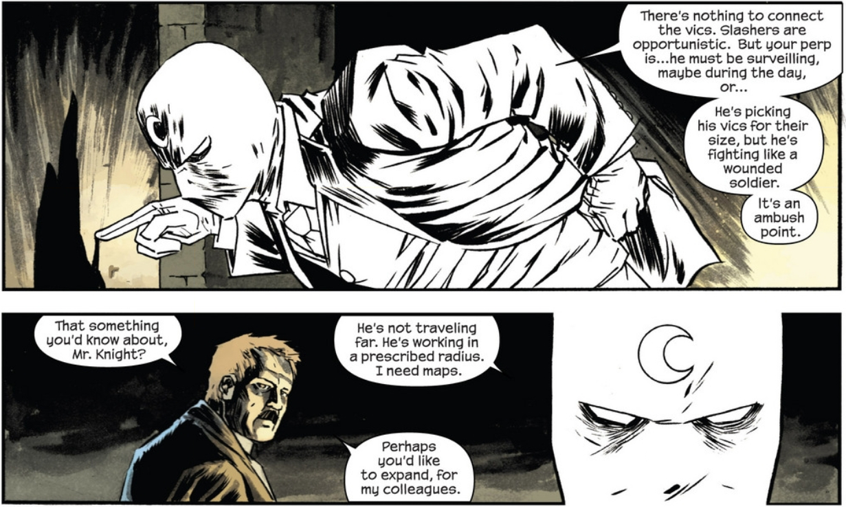One of my favorite panels is where MK is talking to the other officer, explaining to him that he’d rather go underground and find this killer for them. This panel is great for two reasons: he’s basically saying I know you’re to scared to go and won’t and it shows me that that ‘insanity’ part of Moon Knight is perhaps actually just underneath the surface. I mean, look at him. That’s a badass panel.