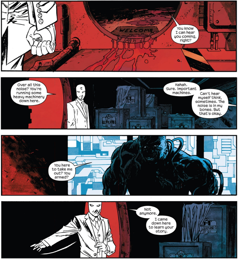Though, should we be calling that “therapy?” The issue ends with the subversion of the repeated assessment that Moon Knight is insane. But that explanation… sounds an awful lot like insanity, right? Drew, I know we’ve been reading a lot of number ones, and know we’ve dinged them all for not presenting a clear image of who their hero is, and it feel like this issue is doing the same, but like, on purpose. Also, I didn’t say shit about Declan Shalvey’s pencil work, but holy hell can that dude assemble some effective images — that splash of Moon Knight descending into the underground is one of my favorites (again, the colors!). Are you as excited about this issue as I am?