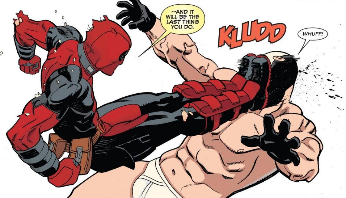 Greg: Crossbones’ tighty-whitey outfit strikes me more than a weird little detail, Patrick. It speaks to the power of commitment, both in storytelling and jokes (often inextricably linked in the world of Deadpool). It could’ve been easy to, after hitting the cheap laugh of Crossbones losing his pants, write off returning him immediately to his normal outfit as a consequence of cartoon logic, yet Duggan, Posehn, and Hawthorne are more interested in putting cartoonish actions under the microscope and examining the real world consequences. As Wade is learning, real world consequences are forever, and the fact that the storytellers are sticking to this provides a lovely mix of external hilarity and internal poignancy.