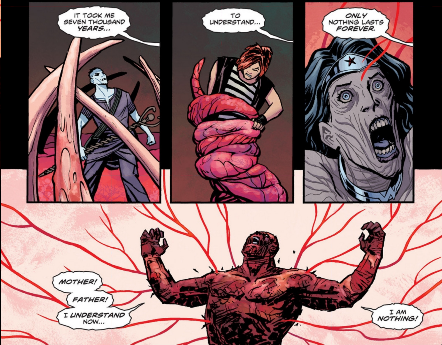 Elsewhere, Artemis senses a broken connection with her twin brother, and insists that Hermes ‘port them to Olympus. Thus, everyone is there to witness the First Born, freshly soaked in Apollo gore, take the throne of Olympus and start sucking the life out of everyone with these creepy veins. Wonder Woman stands up for friends, but even she is overpowered… until Hera, who was granted her godliness as Apollo’s final act, appears on the scene. The First Born being her first born, she decides that she needs to do whatever she can do clean up his mess, which in this case means safely spiriting everyone away to Themyscira and reverting the Amazons to human form.