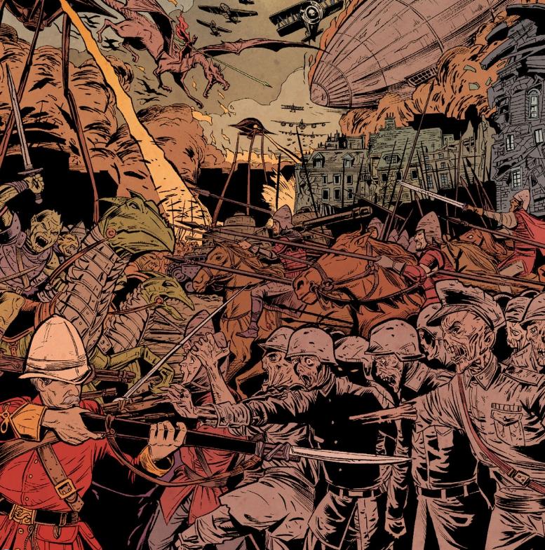 Patrick: That’s the best part about War Stories — they’re not the specific property of anydiscipline. English major, history buff, sci-fi nerd, classically trained thespian: we all feel a sense of ownership over them. While I might have been most excited to see the War of the Worlds tripods show up — they are acting as the cavalry that inadvertently comes to our heroes’ rescue — I’m mostly enamored with the specificity. Very early on, Carey makes sure we understand that there are both Vanilla Nazis and Zombie Nazis running around, and they’re totally different. But this is a war story, you don’t really want to hear about the action; you wanna see it. Peter Gross is happy to oblige. The amount of detail on every page is stunning, especially as the armies grow in variety and number.