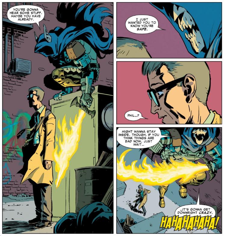 Patrick: I mean, if nothing else, I appreciate having the story refocused on Batman. One of the weirdest things about the last story arc was that it felt like it was a Two-Face story featuring Batman. In fact, I’m not even sure we really need this title to be re-naming itself with every issue anymore. While Bruce is teaming up with various members of the League — by all accounts Diana is next — the thrust of the series is back on Batman’s relationship with Robin. That’s always when the stories were the strongest anyway. And I may just be a sap, and miss Damian something awful, but the image of those half-developed heretics was genuinely upsetting and actually left me feeling uneasy about this whole crusade. If these creatures really are the same genetic make-up as Damian, but haven’t been given time to properly develop, that makes them more victims than anything else. Bruce says as much when he commands Aquaman not to kill any of them. I don’t know — does it bother anyone else that Bruce seems cool letting his horribly mutated off-spring rot in an Atlantian jail?