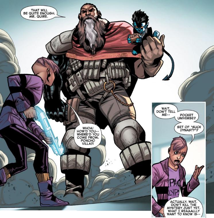 This is one of those uber-powerful dudes that can read minds, knows the future and is confident that the future will play out according to his vision NO MATTER WHAT. That’s narratively overwhelming, and just when I was starting to get a handle on how Quentin’s relationship with his future self was going to shape the lives of the X-Men around him. Maybe it’s telling that both Quentin and Wolverine just make jokes about this guys identity: it’s just such a story-breaking concept. And then there’s the final page reveal that he’s planning to kill Evan? It’s just too much, you know? I’d like to hear from fans of the previous series to see if they’re also feeling like there’s too much going on here, of if I’m just suffering from too-many-faces syndrome.