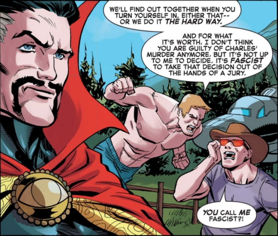 YOU call ME fascist?!What? Cap doesn’t think Scott’s guilty? How is there still animosity between them? Oh, right: Scott needs to stand trial for a crime Cap doesn’t think he’s guilty of…just because. By that logic, shouldn’t literally everyone have to be tried for every murder, ever? I’m pretty sure we tend not to arrest people/try them with crimes unless we think they’re guilty. I get that this is somewhat judgement call-y, but again, how many times has Cap arrested Wolverine for all of the people he’s killed?