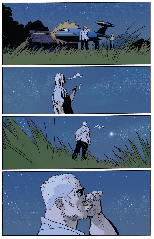 In these deceptively simple four panels we know without a doubt that Duke is going to leave Earth to save Tantalus. He’s weighing the possibility of death by violence versus death by boredom and sadness. It’s a simple choice for Duke, even if he is too old for this shit.
