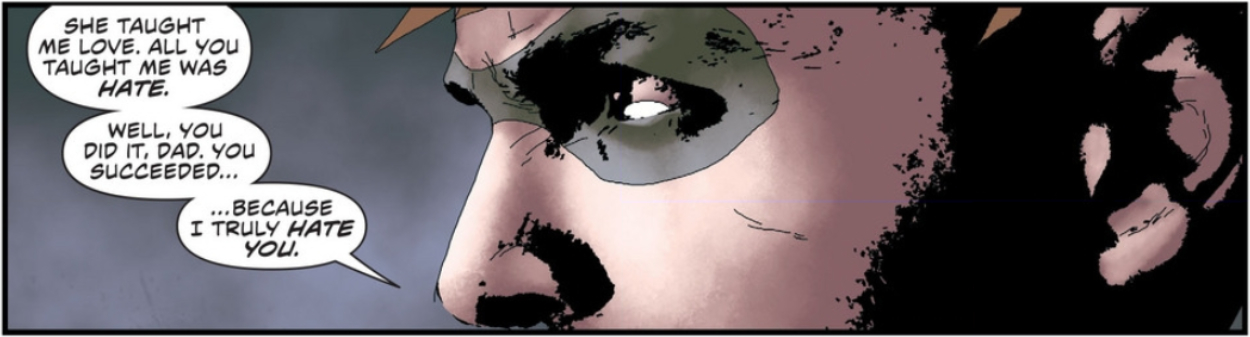 Which is the real arrow through the heart here?Yikes. That’s a hard sentiment to tell your father at any point, but especially as basically your last words to him. Ollie obviously doesn’t expect these to be the last thing he says to his father, but I know he’s going to feel guilty for saying it — especially in light of Robert’s heroism at the end of the issue. My only hope is that he will find comfort in a memorial Van Dyke, finally becoming the Ollie we all know and love.