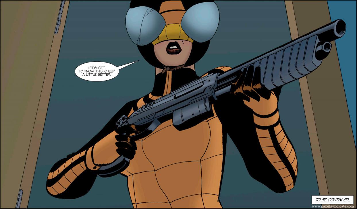 On the opposite end of the exposition spectrum, Private Eye 6 goes beyond simply making itself clear to us, drawing almost all of the characters closer to the answers they’re looking for. P.I. and Raveena’s interrogation of the guy from the tubes goes well, pointing them in the direction of Nebular — the squid-mask guy who has been helping DeGuerre with his missile. Er, rocket. It’s meant to deliver a satellite, not a bomb. Anyway, Nebular needs a computer to guide the dang thing to orbit, so DeGuerre agrees to drive him to his house…where P.I. and Raveena are already lying in wait. A good bit of real estate is given over to DeGuerre’s hit men’s mostly botched attempt to kidnap Melanie (who it looks like is going to pull through just fine), effectively drawing Strunk closer to answers, too, but it’s hard to think of much else with Raveena getting her game face on. I mean, come on, you can almost hear her racking that shotgun!