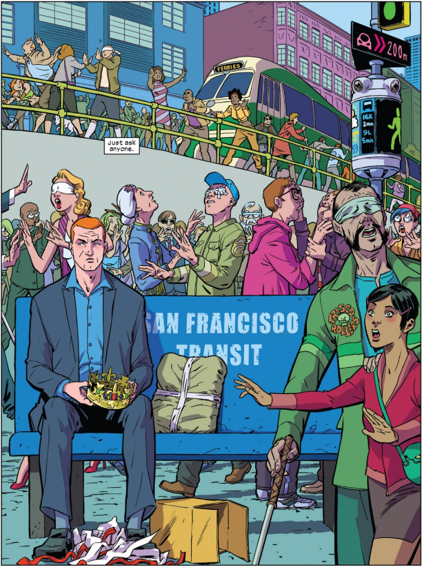The feature picks up on Matt’s 50th birthday, where he’s retired as a crime-fighter, and worries too much about his only son. Waid employs some How I Met Your Mother coyness about the intervening years — most notably avoiding any substantive hints as to who his son’s mother might be — but gives us enough to understand that he’s leading a fulfilling life (no husk-of-his-former-self The Dark Knight Returns-isms here). That is all put in jeopardy when the majority of San Francisco is suddenly rendered blind — a chaotic scene that Javier Rodriguez renders with absolute abandon.
