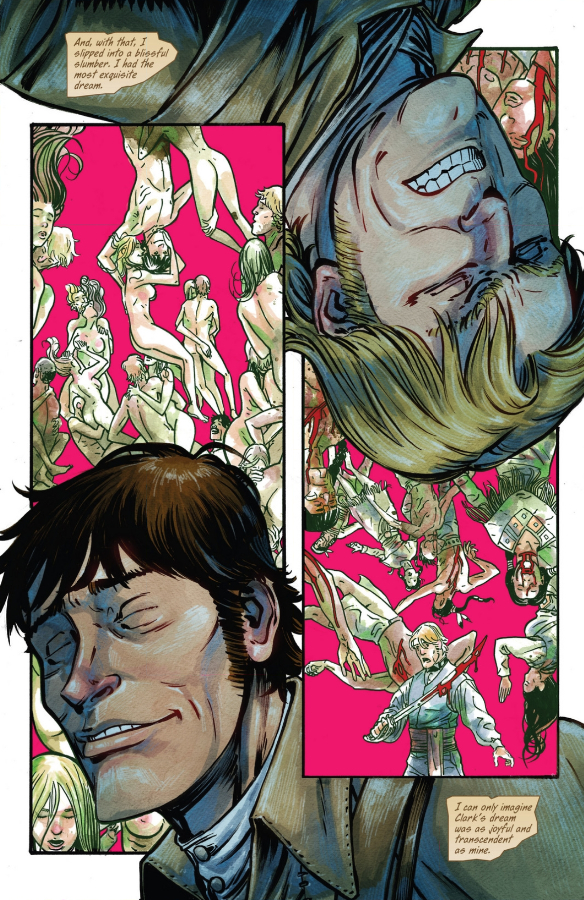 Sex and ViolenceClark’s genocidal fantasy may make more sense given his violent nature, but it sure is a surprise in contrast with Lewis’ orgiastic vision, largely because we don’t associate Lewis with sex at all. Lewis’ vision, so far as we know, is entirely fictional, an abstracted heaven of sorts, and his face is appropriately serene. Clark, on the other hand, seems intensely distressed by his vision, at times looking downright horrified.