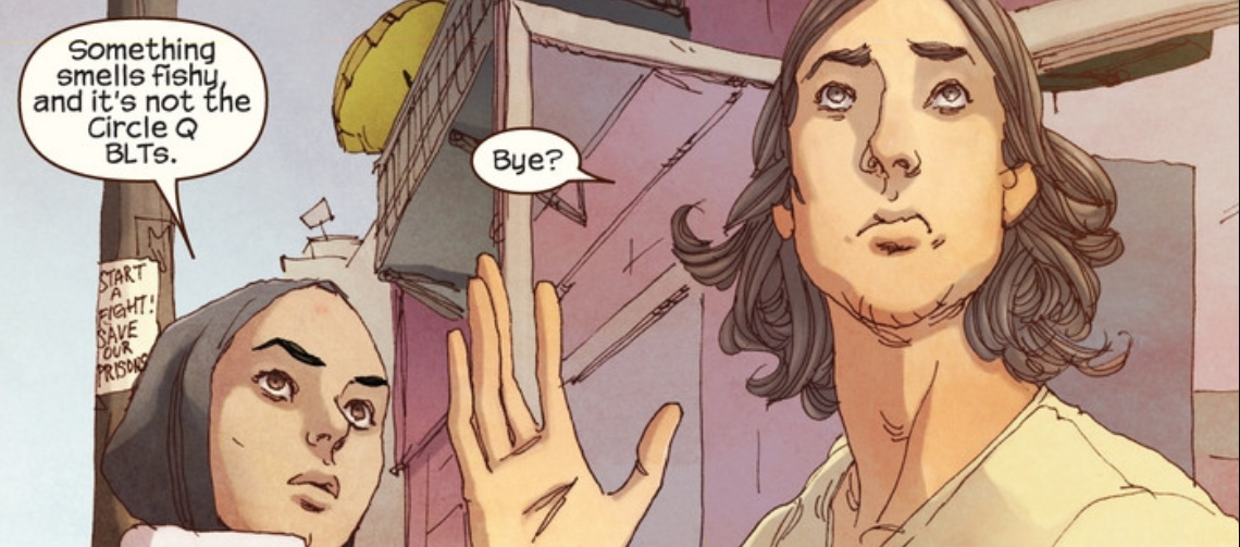 Kamala stands out at the mosque when she interrupts the sheikh (Islamic scholar) during his lecture and complains about the partition to her brother’s disapproval. She bails on the lecture and tries talking to her friend, Nakia, but doesn’t feel like she can really confide in her. And don’t forget that she’s hiding from Bruno since he ratted her out last issue. What could be more awkward than actively avoiding one of your best friends? Try morphing into your mother’s image in the girl’s locker room. Even Kamala admits that’s a little too Freudian for her comfort. After getting detention for her antics, Kamala goes back to talk with Bruno and finds what appears to be Circle Q getting held up. Does this signal a return for our young hero?