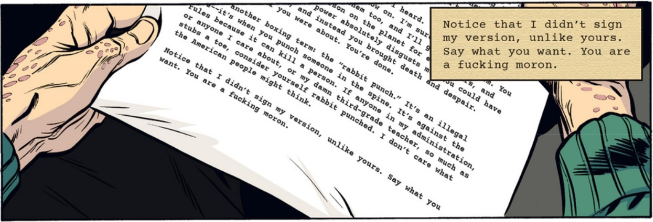 The boxing analogies Blades uses are half-fitting. Elected President at a time of political unrest and inheriting two misguided and resource-draining wars is the boxing equivalent of being backed up against the ropes. The additional burden Blades learned of with Letter 44 was like a barrage of hooks and jabs that nearly knocked him out cold. Blades’ letter is his way of coming out swinging, but I can’t help feeling it’s a little anti-climactic. When Blades arranged for a face-to-face meeting with Carroll it seemed like he was being the bigger man, doing what Carroll didn’t have the guts to do when he left office. Really though, Blades seems to let his predecessor off the hook, exiting their brief meeting by thanking Carroll for coming in, and leaving Carroll to find the scathing letter on the desk. Blades had the opportunity to be the bigger man, but went for petty retribution instead. Considering at least one person was killed in the effort to bring Carroll to the President — a meeting Carroll ultimately attended willingly — Blades comes off looking like a heavyweight chump.