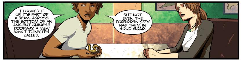 RP: You also have moments — like in the second issue where they’re in the library and she’s geeking out about the Book of Kells — where she’s still a nerd about those history things.