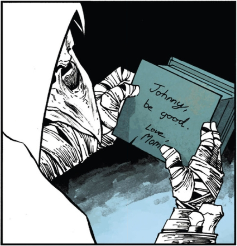 The choice of name and imperative to “be good” almost certainly seems designed to evoke “Johnny B. Goode”, as if Johnny’s crisis of conscience were as much about Rock’n’Roll philosophy as it is about morality (note the “History of Punk” book amongst the wreckage where Moon Knight finds the bodies). It’s an absurd idea, but it gives power to the idea of the music box as a totem of values. Music pangs our nostalgia in the way few things can, so whether that box is playing Brahms or Berry doesn’t really matter — it represents some piece of Johnny’s innocence that he regretted losing.