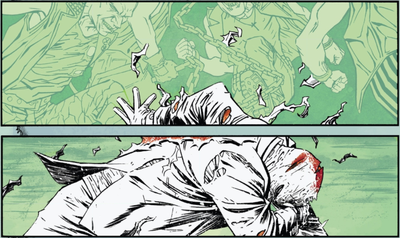 We’ve spent a lot of time talking about what Moon Knight’s impeccably white uniform means, but I doubt we’ve even come close to saying everything there is to say about it. We’ve discussed how (like in this image) Spector’s uniform makes him stand-out, sets him apart as something separate from the rest of the world he inhabits; we’ve also pointed out how it connects Moon Knight to the gutter, the very same gutter we saw as a representation of death in issue 2. This issue takes all of those ideas and makes them obvious, using them to draw a solid comparison between Moon Knight and the Ghost-Punks: