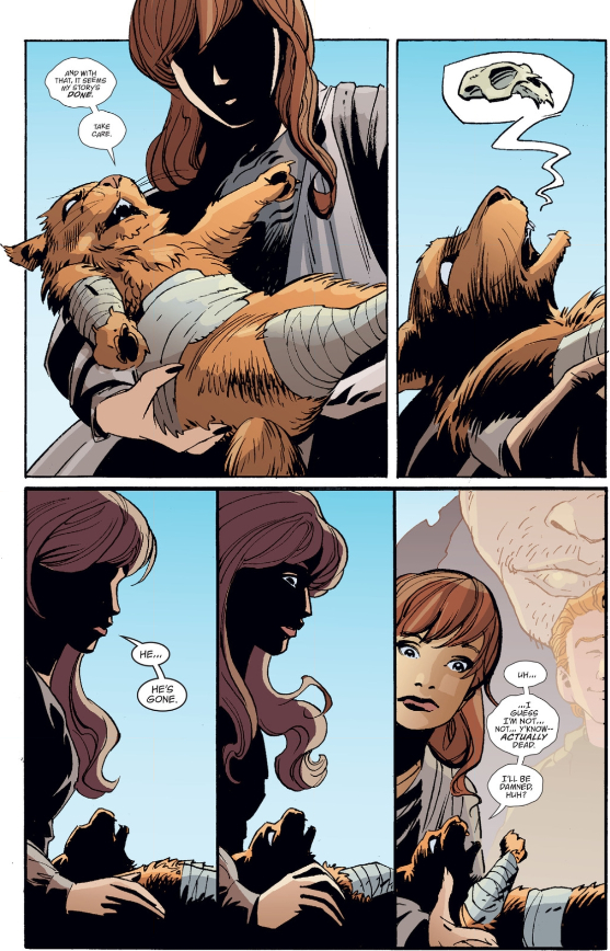 At this point, virtually any ending could be satisfying — having the fight go on, having the characters live happily ever after, even killing all of the characters. That last one doesn’t seem like an emotionally satisfying ending, but note the last panel Patrick posted — I’m not entirely sure who that’s supposed to be in the background, but the faded inkwork sure makes them look like memories (or ghosts), suggesting that Puss just had a very similar experience to what Bigby went through back in Fables 134. It effectively reminds us that there’s a satisfying afterlife for these characters, and that they’ll find peace, even if we never get to see it — or even because we never get to see it.