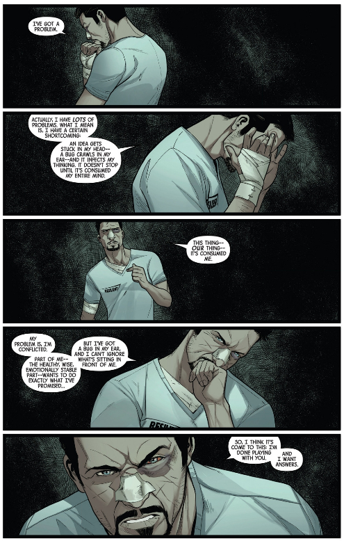 Man, Tony’s not looking or acting his best — that “Resilient” written on his shirt is painfully ironic, isn’t it? I don’t know where he got those injuries, but I don’t think it matters; I feel like writer Jonathan Hickman and artist Valerio Schiti are using them to represent the toll fighting the Incursions has taken on Tony, using them as a physical manifestation of his mental turmoil, and man are they effective — the guy looks positively unhinged.
