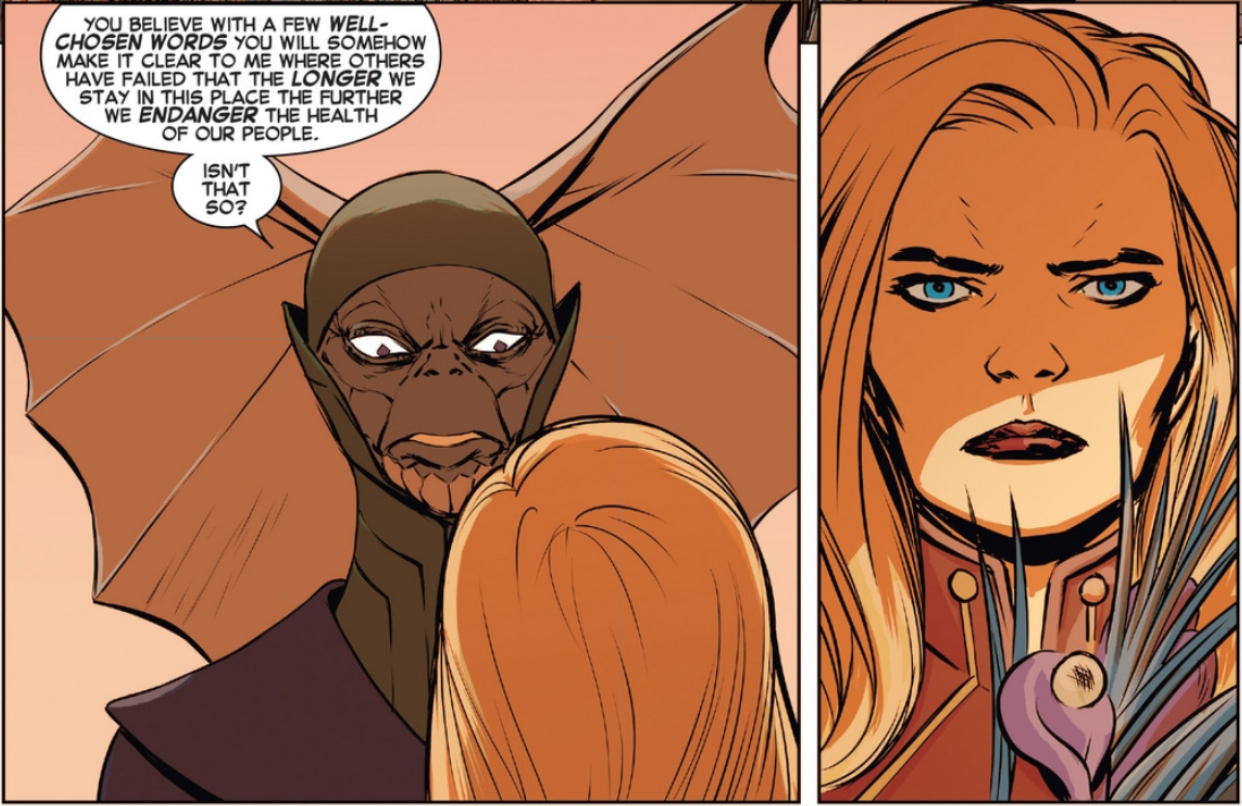 It’s not the most elegant explanation (seriously, why couldn’t they just move the sick people, too?), but it serves to give Carol a perspective that she didn’t have before arriving. She swings pretty effectively from “why don’t these silly people just do this simple little thing?” to “I can see why that thing is far from simple, and why these people are far from silly.” That kind of receptiveness has long been part of this series DNA, but with so much of the meta-discussion of this series tied up in feminism — from Kelly Sue DeConnick’s place in the comics landscape to the strength of Carol’s characterization to the welcoming home so many fans have found in this series — it’s actually refreshing that this perspective is focused on intergalactic diplomacy, rather than anyone’s gender.