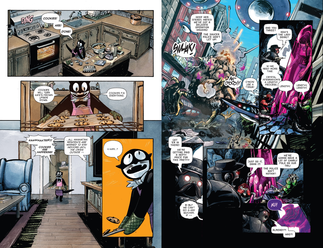 Kate’s actually taking most of this in stride. As the first issue gleefully illustrated a number of times, fighting for her life against bizarre threats is old hat. The thing that is troubling our hero is the possibility of who’s behind all this: her siblings. In a poignant flashback, seven year old Katie asks her father for a brother or sister, but he categorically denies her. His hemming and hawing at first comes off as completely relatable — how do you explain to a child who just wants a friend that you can’t bring another life into this world for any number of personal, emotional, financial, or otherwise-embarrassing reasons? As the issue continues, and we get a glimpse at the force behind the cat-gangsters, a mysterious, magical character that uses some kind of serpent-virus-monster to communicate with his/her underlings.