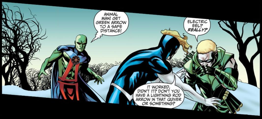 Animal Man, Green Arrow and Martian Manhunter in the snow