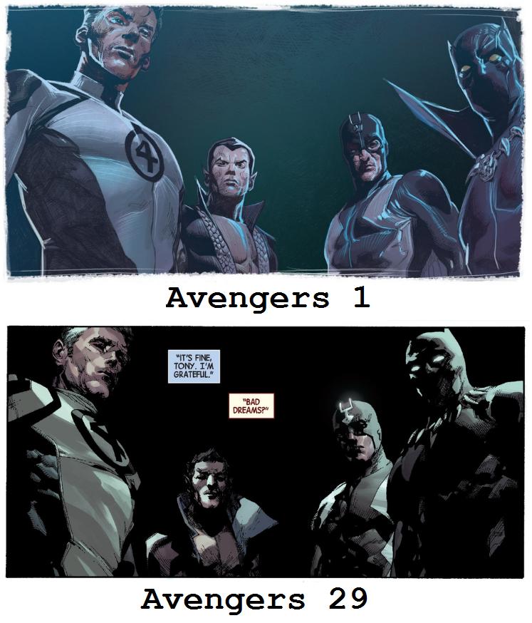 Avengers 1 and 29 comparisonNow that “Bad Dreams?” “Something like that.” is a haunting refrain — a loaded phrase imbued with a uniquely Jonathan Hickman-level of meaning. Hickman milks that meaning for all it’s worth, dragging out the actual point of conflict between Steve and Tony to the last possible second. Even as Cap is in open aggression, Tony admits to nothing, preferring to keep his cards close to his chest. I’ve usually got a pretty good bullshit detector when it comes to “and now the heroes fight,” but it was goddamn exciting to see all the Iron Man suits power up to face down Captain America and his small band of demigods.