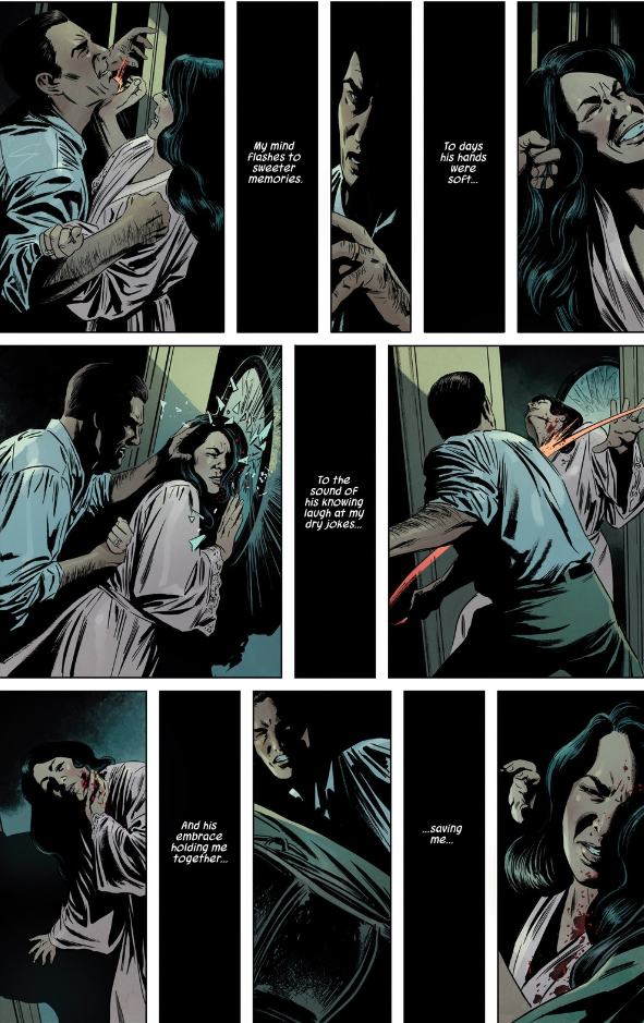 The issue doesn’t start in duress; at least, not on the surface. Velvet and Richard are trying desperately to have a normal honeymoon (even though it’s their fourth), and for a moment they seem to be succeeding, exchanging playful banter and giving each other long, From Here To Eternity-esque smooches on the beach. Yet when a waiter leaves a napkin that doubles as mission instructions, everything changes, culminating in a realization that he is a double-crosser who must be killed. Here, I must note the brilliant use of color from Elizabeth Breitweiser; as Velvet’s emotional state of mind grows darker and more abstract, so too does the color palette. The bright and sunny beach is far away from the dark and shadowy room that Velvet and Richard have their final battle in.