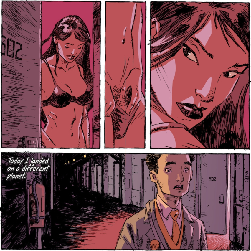 The next scene features the most obviously first-person narration, with letterer Fonograficks even rendering the voiceover in italics, implying that the comments are those of a personal journal entry. The scene follows Tian Chenglei, an art student in China moving to Shu, the site of another tree landing. He is warned about the conditions before entering, but enters with all of the youthful enthusiasm he can muster…which quickly curdles to uncertainty, and even fear. Howard brilliantly distills that experience to a single moment as Chenglei makes his way to his apartment.