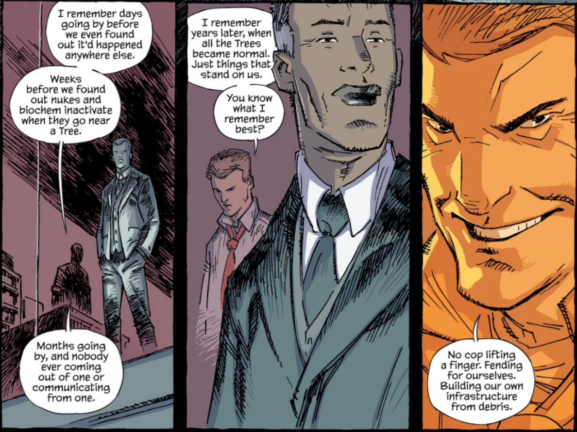 The issue opens in Rio de Janeiro, ten years after what a narrator explains was the first contact with an alien intelligence…inasmuch as an invasion that utterly ignored humanity could be called “contact”. It sets the stage for a dystopian future where humanity lives in the shadow of these “trees”, which could be best described as malevolent buildings. Or is it just that they’re just indifferent? There’s an obvious parallel to our own disregard for our environment, highlighted here as the trees begin oozing some kind of toxic sludge that destroys everything and everyone it touches. Perhaps the trees are unaware of their effect on us, perhaps they just don’t care, or maybe they are fully aware, but have something to gain from destroying their environment; in any case, it’s easy to see our own actions reflected here.