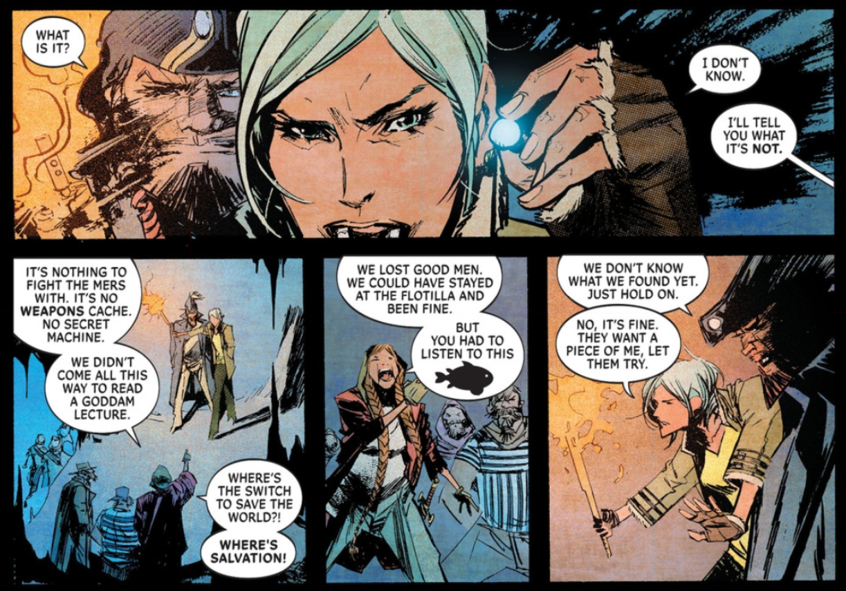 Then again, it’s possible that we still have no idea what this series is ultimately about, and the practices of the Bogong are actually of key importance. Snyder is quick to dismiss impatience in this issue, giving would-be critics a voice in Captain Mary’s restless crew.