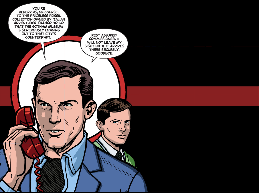 The issue begins with Dick Grayson preparing for a date and Bruce Wayne getting a — for lack of a better term — batcall from Commissioner Gordon (nice code work on Alfred’s part). It seems a collection of priceless fossils are being shipped through a dangerous area, and Gordon would prefer Batman’s supervision. Wayne is a paleontology buff (naturally) and decides to take the case as himself, leaving Dick to go on his date. While on the train, Bruce runs into none other than Britt Reid and his valet Kato, whom we know better as the Green Hornet and, um, Kato (though he’s brainstorming some cool names himself; I like the Black Bee the most). The trio exchanges some fun, passive-aggressive banter as to who’s the superior hero, until the train grinds to a halt. It seems that someone has literally glued the train to the tracks. Someone who they have all encountered before. Someone by the villainous-yet-pretty-dang-silly name of General Gumm! (formerly Colonel Gumm) So Dick must cut his date short and meet Bruce aboard the train (holy heartbreak, indeed) for a quintuple showdown, and watching Batman, Robin, the Green Hornet, and Kato face down Gumm is remarkably satisfying. The issue ends in a genuinely effective cliffhanger, as Gumm glues their feet to the train and un-glues (thanks to science) the train from the tracks, sending our heroes on a collision course with an oncoming tunnel. Will they survive?! While our narrator tantalizes us that “the worst is yet to come,” I have a feeling it’ll only get better from here.