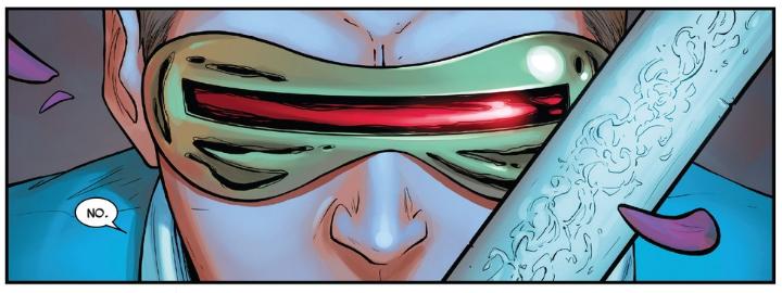 Scott and Chris Summers have been bopping around the galaxy, having a good ol’ father-son time. They make a pit stop on Yrzt (which is a city, a planet, or a city-planet) so Chris can ask his skeezy friend Baroque for… a little help. Chris is pretty good at keeping this from his son, but they’re there to pick up the purple-y substance Chris has been injecting into his neck. Happily oblivious, Scott helps his father fight off a band of bounty hunters looking to collect on the price(s) on Corsair’s head. Cyclops may not know his way around a blade just yet, but that doesn’t stop this moment from being so bad ass.