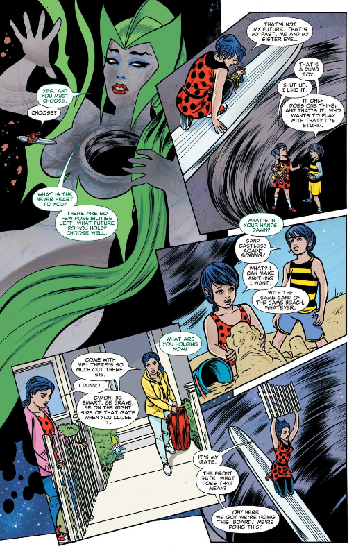 For Dawn Greenwood, her childhood totem is a toy monkey that symbolizes not only her desire for familiarity and routine but her sister’s disapproval of those habits. Does that sound a bit harsh? Each flashback panel involves Eve chiding Dawn about her choices. Maybe the Never Queen’s parting message to Dawn of how “you choose your future” implies confronting her role within the nuclear family and becoming less enmeshed with her sister. My training in family therapy could be creeping in too much here though. I have a feeling Dawn’s reunion with Eve will be a memorable part of future issues.