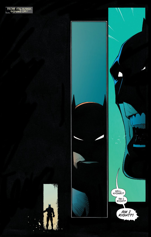 This page follows directly after the previous one I posted, and opens on Batman admitting he probably won’t make it back from this mission and telling Alfred he loves him; Capullo gives this beat the space it needs to play out with the proper gravity, but then immediately begins closing the camera in on Batman, with Batman growing larger and larger as his confidence grows, or perhaps as his patience for playing Nygma’s games finally reaches its breaking point. Either way, it’s no coincidence that Batman first takes command of a page just as he finally manages to come face-to-face with the Riddler.