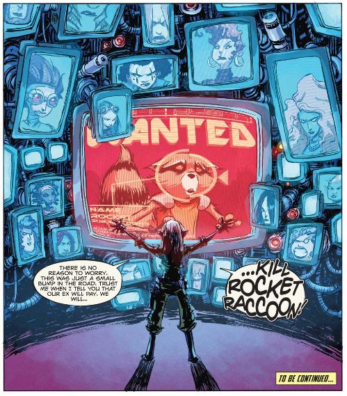 Take, for example, the reveal at the end of the issue: Rocket is being set up by a League of Evil Exgirlfriends. Even without borrowing Bryan Lee O’Malley’s language, the similarity to Scott Pilgrim (…do you like his name?) vs. The World is pretty clear. Of course, part of what makes this variation on the League so intriguing is that, instead of there being seven of them, there are seemingly countless well-organized exgirlfriends, decked out in crazy sci-fi goggles and shit, ready to take revenge against our favorite raccoon.