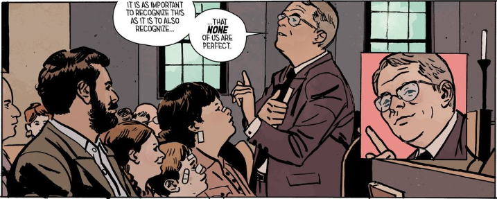 Like I said before, Breitweiser’s colors don’t do this guy’s moral credibility any favors, but this insert shot is the final nail in his “can’t-fully-trust-this-guy” coffin. The jump from a thought stemming from Jesus’ famous “Let he who is without sin cast the first stone” sentiment, to a facial expression that seems to say, with its pursed smile and extended finger, “You best believe I’m casting that stone,” is succinctly evocative to me. It makes me think that the Reverend may have some past traumas he is avoiding (and I’d love to see some of those expose themselves in the future).