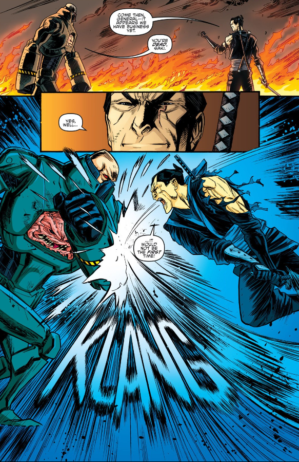 It’s such a patient set-up, but pays off hugely when Shredder blows the whole thing and flips out to the deck for the real fight. That’s basically all that happens for the rest of the issue: they fight. Where I think this fares much better than the usual “let’s you and him fight” scenario is when the fight actually occurs. I don’t know why this is the case, but so many comics seem convinced that their characters can engage in fighting and diplomacy at the same time. Once Krang and Shredder start throwing punches, they’re not still negotiating with each other – they’re just talking shit.