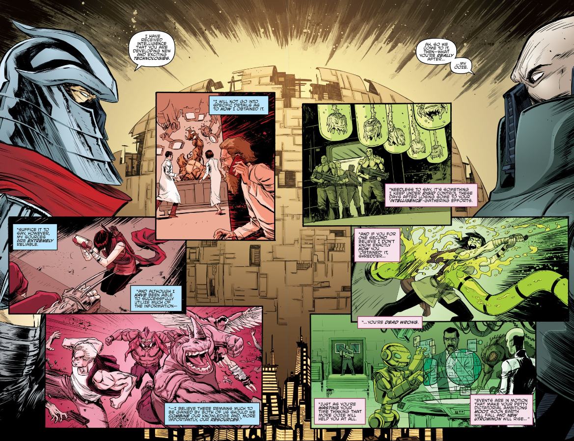 Of course, this issue offers the first taste of that friction, which might be why I’m so excited about it. I tend to be leery of “Let’s you and him fight” scenarios, but the inevitable fight between Shredder and Krang feels both totally earned, and totally satisfying. Their motives are at cross-purposes, and both are well-established as dudes who would fight over such a thing. Heck, these dudes would fight over ANYTHING, but Waltz takes the time to lay out their goals here. More importantly, Smith takes the time to layout an appropriately epic battle, balancing careful fight choreography with big, jaw-dropping action beats.