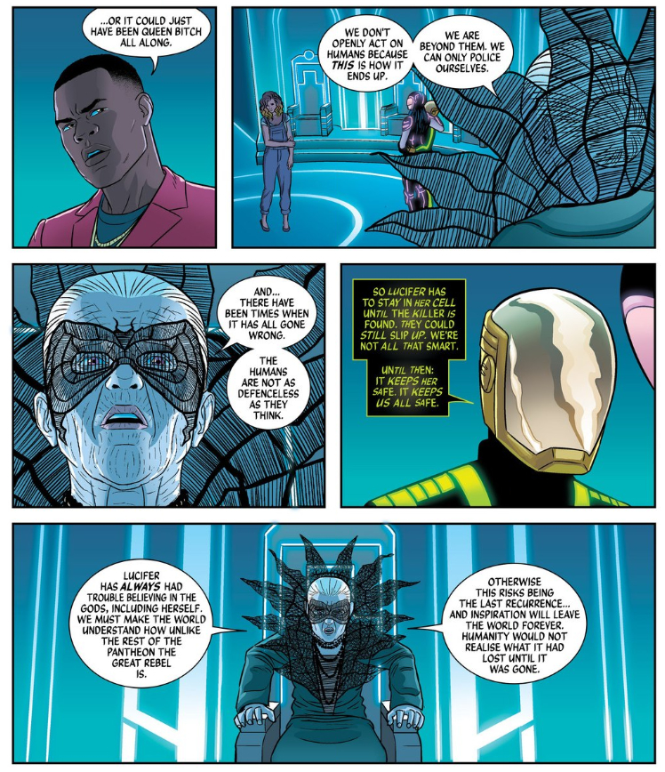 Yeah, the one thing Gillen makes abundantly clear is that none of the Pantheon is happy with their situation, which actually leads me to a second theory: whoever framed Luci wanted her to escape prison, and hopes to bring Ananke’s worst fears to life. What if the framer is trying to turn humanity against the Pantheon, trying to end the recurrences? Perhaps they think ending the recurrences would stop them from dying in two years, or perhaps they’re simply tired of immortality and the endless grind of being reborn every 90 years. Either way, the more we find out about the Pantheon, the more the pool of suspects grows larger instead of shrinking.