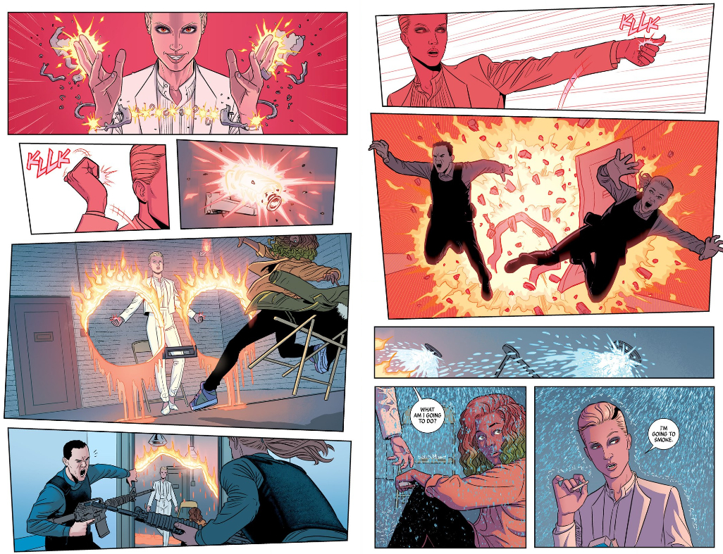 The rest of the book focuses on Luci’s escape, and, of course, McKelvie makes it spectacular. It’s no secret that Gillen and McKelvie favor grids — especially 8-panel grids — as their layout of choice, and they use it to great effect during Laura and Luci’s conversation particularly, but the fact that McKelvie sticks to grids throughout the entire issue makes the moment he breaks free from them all the more powerful.