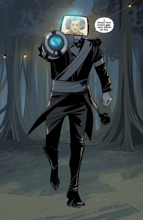 But I want to get back to the images that splash across the robot’s faces, specifically LC’s cameo. (Drew, you thought that was just going to be a tossed off observation, did you not?) This set of chapters has been very tightly focused on our young family and the Robot Royals, all but ignoring the rest of the cast of Saga. We’ve been so preoccupied with the false flag of “this is how my parents split up” that we’ve forgotten there’s a whole universe swirling around out there. Hell, I only just now remembered that The Will was last scene in a hospital bed, with Lying Cat and Gwendolyn by his side. Remember when we got a glimpse of those two reporters in the previous issue? LC’s appearance — albeit on the screen of an old black-and-white — forces the reader to process that information, which in turn triggers memories of the other characters related to Lying Cat. It’s always risky to declare that something is foreshadowing before knowing that the payoff exists, but I’m guessing that this heralds the return of that trio of characters. The audience is now subconsciously primed for their return.