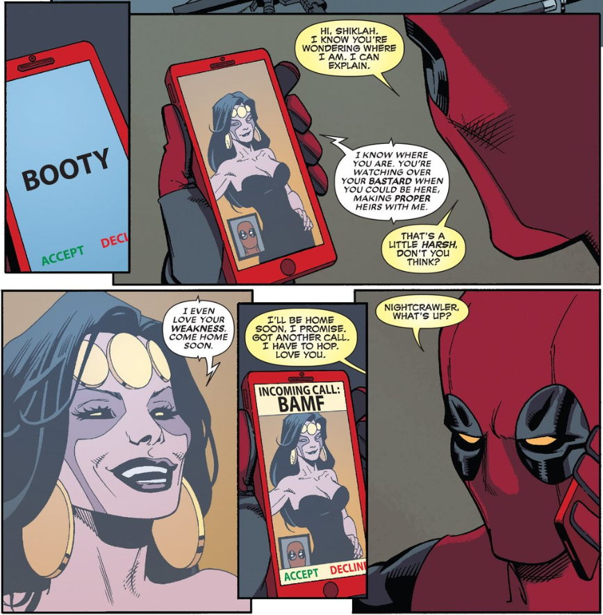 Booty CallThe conversation basically boils down to explaining why the thread of Deadpool being married is on hold, though it has the added benefit of demonstrating just how weird Wade’s life is right now. Conversely, Deadpool’s pre-marriage emotional baggage is so hefty that everything that’s happened since runs the risk of feeling a little thin, but I think the relative normalcy of the conversation emphasizes how close Wade could be to happiness.