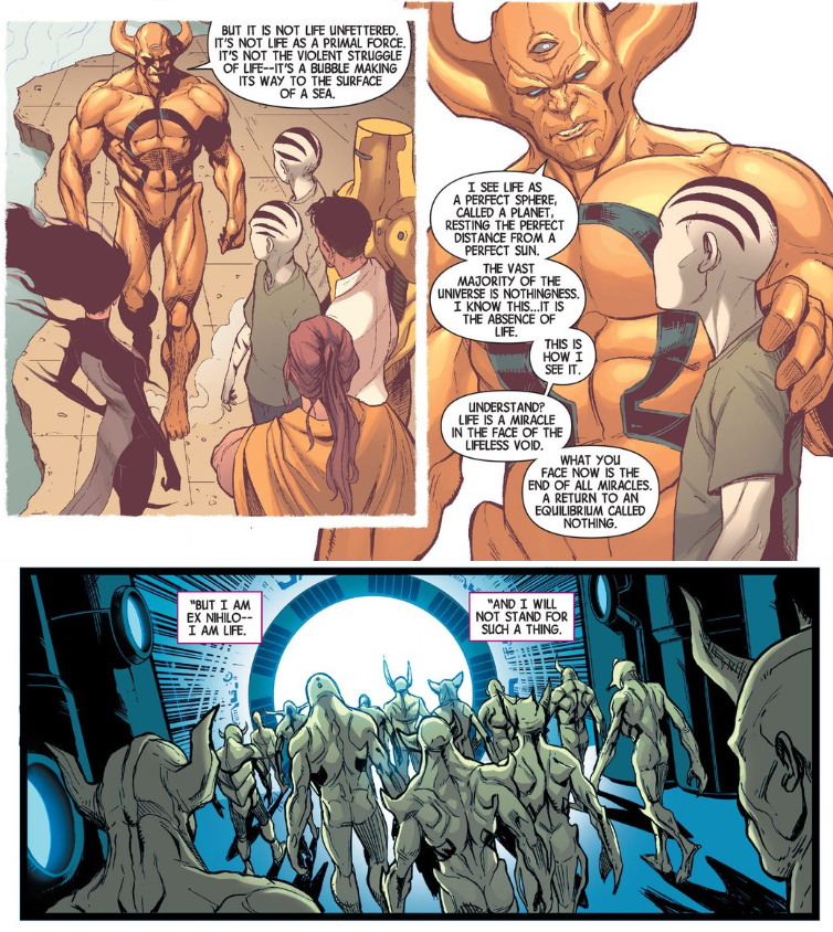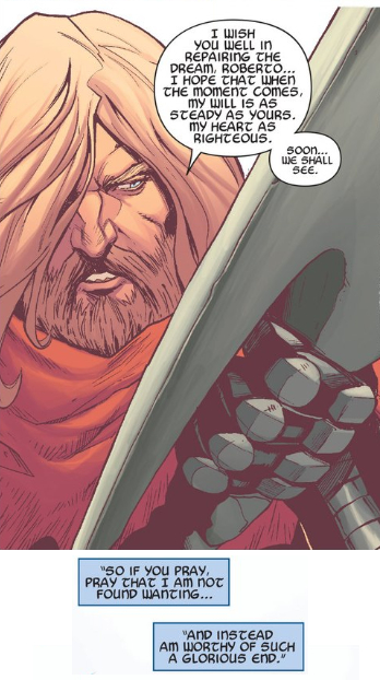Actually, if anyone is motivated by self-interest, it’s got to be Nightmask and Starbrand. When they meed with Bobby, their discussion doesn’t touch on sacrifice or saving anyone’s life, instead hinging on a dispassionate proposition about “problems.” They’re motivated by their own curiosity above all else, but I think a diversity of motives is important in the group that ultimately leaves — Abyss and the Ex Nihilii want to preserve life, Hyperion wants to save his children, Thor wants to be the hero, and Nightmask and Starbrand want to see cool stuff.