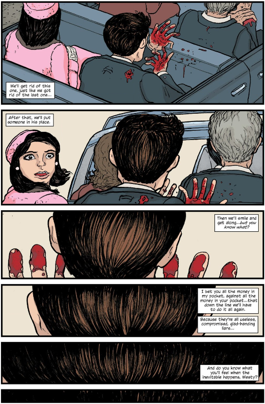 Oh, right: Spoiler Alert. I think we saw this moment coming from the moment Kennedy was introduced to this series, but it’s actually pretty tragic, in spite of the gory glee artist Nick Pitarra takes in carrying the bullet’s-eye-view onto the next page, which maybe takes the phrase “splash page” a bit too literally. Think about it: last issue found a paranoid Kennedy sending LBJ to close down one of the many threats against his life, only to have Johnson turn around and make a blood pact with Groves and Westmoreland to kill Kennedy immediately.