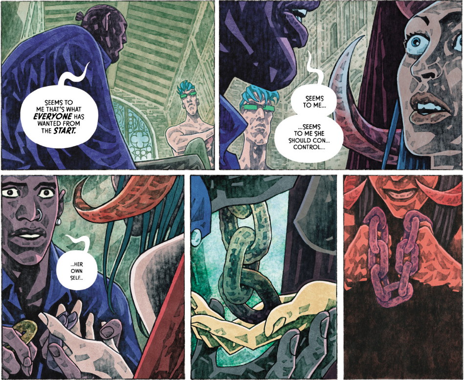 Maybe I’m allowing my cynicism to focus on such a pessimistic reading — there are certainly enough symbols in this narrative to support several alternative takes — but I think it boils down to Dante’s use as a “white knight” here. It satisfies some very prevalent narrative expectations, but maybe at the cost of saying anything new about those roles. Or maybe Veil saving Dante at the end does that. Or maybe I’ve built up some expectation that this series will invert gender tropes that is kind of unfair. I guess you can take your pick as to why I’m wrong, Greg.