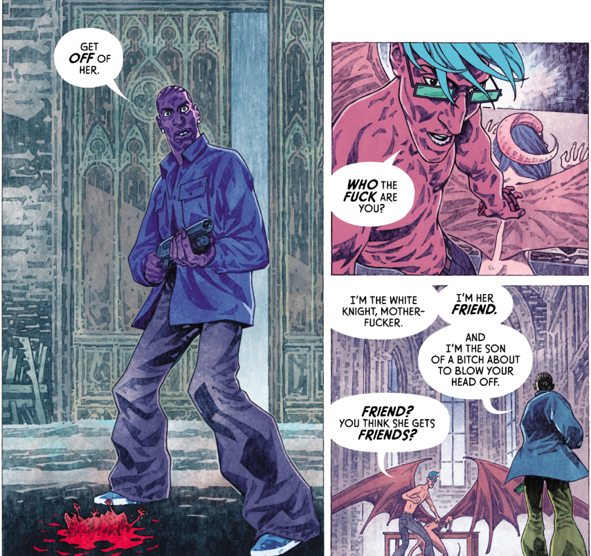As the issue opens, the rat Dante killed springs back to life, and latches on to Gabriel, effectively possessing him. That someone named Gabriel should serve as the messenger for a supernatural entity should make the biblical overtones clear (you know, if the character named Dante and the presence of demons from Hell haven’t done that already). Meanwhile, Veil has returned from her assassination mission, and now Cormac intends to demonstrate his power over her. Again, the imagery isn’t particularly subtle — the totem of her servitude is an actual chain — but they serve the capital-t Themes of this story perfectly. Just as Cormac pins Veil down to have his way with her, Dante makes as heroic an entrance as I’ve ever seen.