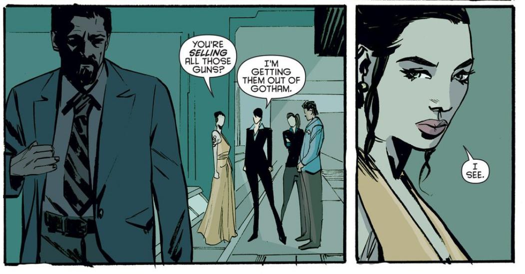 Brown’s doing his best Michael Lark impression and gives Eiko a steely pokerface which almost expresses more by what it’s not expressing. Is she disappointed? Is she masking excitement? Is she working out the next steps needed to move Selina’s plan forward? The point is, she’s critically considering the implications of getting guns out of the city. And then the final piece of observation is that Eiko’s crime-family tattoo is not completed. Well, I use the term “observation” loosely; Eiko comes right out and says “it’s not done.” I originally read that as sorta lazy writing, but upon reflection, I’m convinced that Selina and Eiko are already communicating with each other on a level that transcends small talky pleasantries. Selina’s voiceover in the next panel confirms that she believes the unfinished tatt to be a sign that she’s not committed to her specific criminal organization (“a free agent at heart” — an elegant turn of phrase), and I think Eiko knew what she was implying the second she offered the information that her ink was not complete.