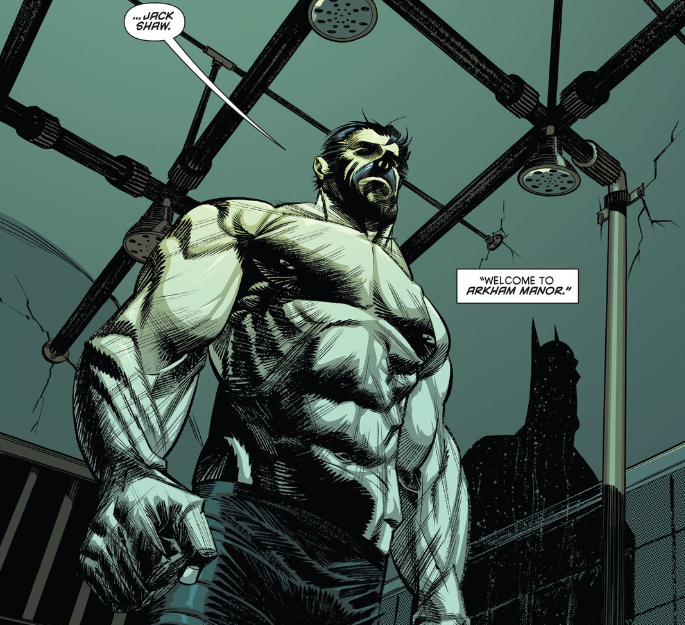 Here, basically at the end of the book, we have Arkham Manor‘s inciting incident: How was it possible for the patent to be tortured and murdered in his cell? Was it an inside job? Batman takes on the identity of a dead homeless man, Jack Shaw, and gets himself committed as a patient in Arkham Manor to investigate.