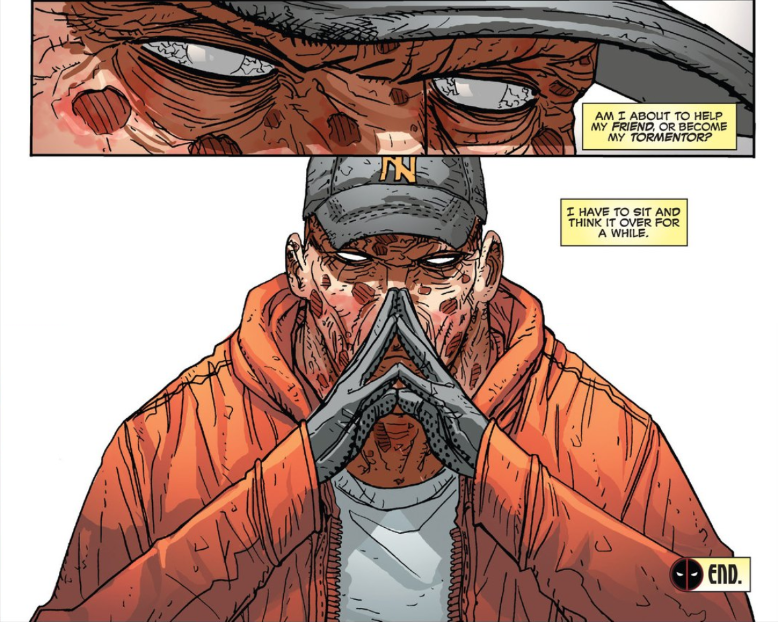 As far as emotional complexity goes, Deadpool is revelatory in this issue. He still cracks effective jokes, needles Steve on Star Wars and Trek references, and kicks A.I.M. agents in the head with no remorse, but Logan’s death seems to unlock something heretofore unseen in him. Humor’s often a defense mechanism, a wall put up to remain strong and impenetrable in the face of adversity and negativity. Wade’s wall seems to be cracking, a gnawing vulnerability eating away within him. Nowhere is this more evident than the joke-free ending, where I’ve never seen Deadpool this thoughtful and distressed: